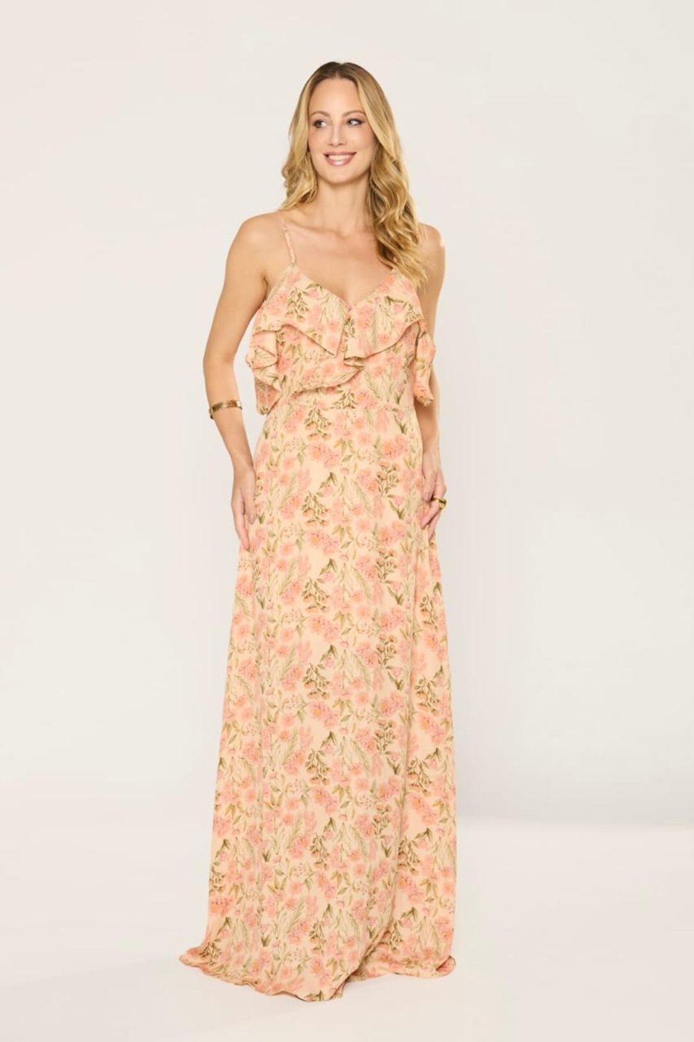 Romântico e leve, este vestido longo traz o charme das estampas florais em tons suaves, criando um contraste elegante. O modelo possui decote em V com detalhe ombro a ombro e alças finas ajustáveis, que valorizam o colo com delicadeza. As mangas soltinhas e franzidas trazem um toque feminino, enquanto a modelagem acinturada garante caimento fluido e confortável. Ideal para passeios ao ar livre, eventos diurnos ou produções mais casuais com sofisticação.