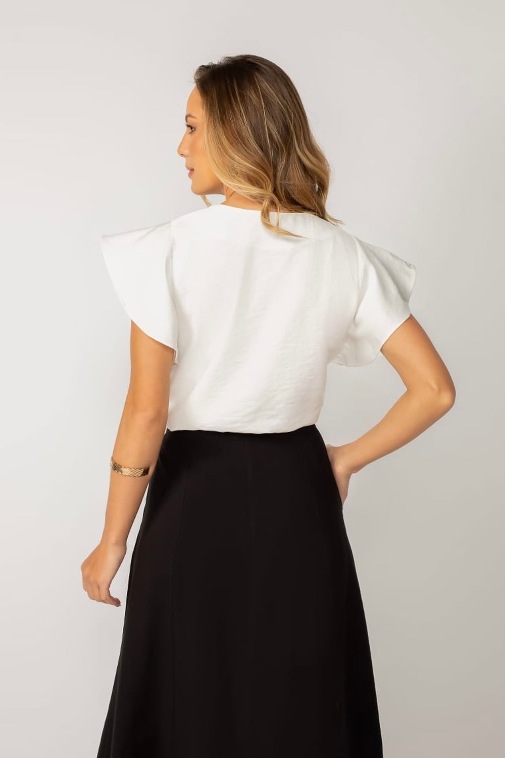 A Blusa Amanda é a tradução perfeita de um clássico moderno. Com seu design minimalista e elegante, ela aposta no decote V e nas mangas com babado sutil para valorizar o visual com feminilidade e sofisticação. A modelagem cropped proporciona um ar contemporâneo, ideal para composições modernas e cheias de personalidade.