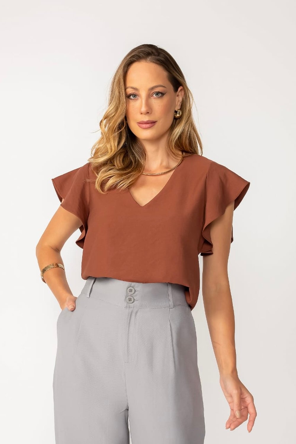 A Blusa Amanda é a tradução perfeita de um clássico moderno. Com seu design minimalista e elegante, ela aposta no decote V e nas mangas com babado sutil para valorizar o visual com feminilidade e sofisticação. A modelagem cropped proporciona um ar contemporâneo, ideal para composições modernas e cheias de personalidade.