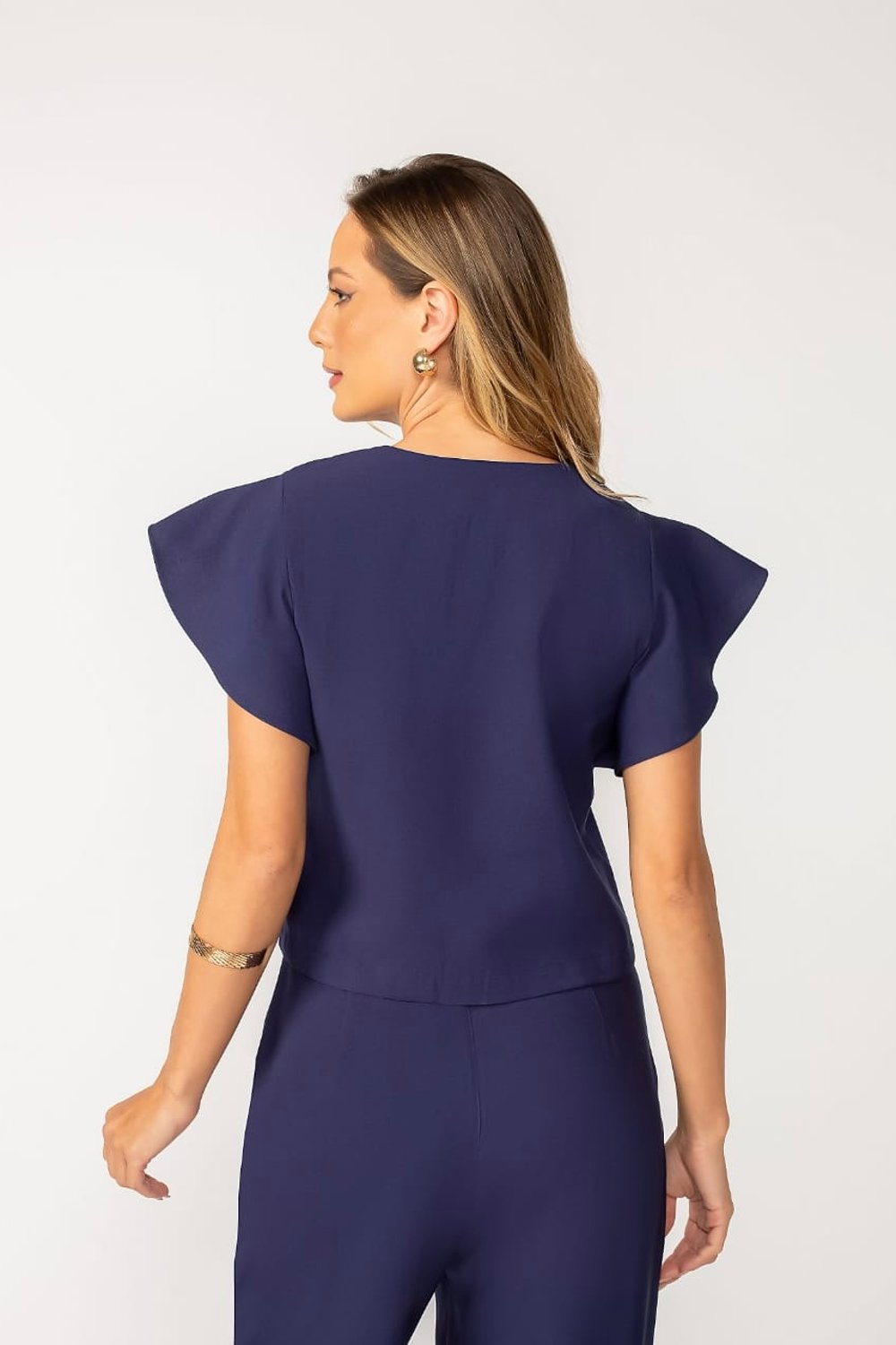A Blusa Amanda é a tradução perfeita de um clássico moderno. Com seu design minimalista e elegante, ela aposta no decote V e nas mangas com babado sutil para valorizar o visual com feminilidade e sofisticação. A modelagem cropped proporciona um ar contemporâneo, ideal para composições modernas e cheias de personalidade.