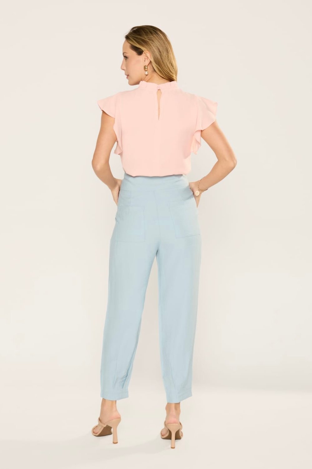 Essa calça é uma peça sofisticada e atemporal, pensada para trazer elegância e conforto ao mesmo tempo. O modelo apresenta cintura alta, que valoriza a silhueta e alonga a perna, além de possuir cós largo com fechamento frontal por botões, trazendo charme extra ao design. Possui pregas sutis na parte frontal, que criam um caimento fluido e ajudam a deixar o visual mais alinhado, sem perder o toque de leveza. O corte é reto levemente afunilado, proporcionando um ar moderno e versátil, perfeito tanto para produções casuais quanto para combinações mais formais. Além disso, a peça conta com bolsos laterais funcionais, que acrescentam praticidade ao dia a dia, sem comprometer a sofisticação do look. O tecido é leve e confortável, ideal para quem busca elegância aliada à liberdade de movimento.