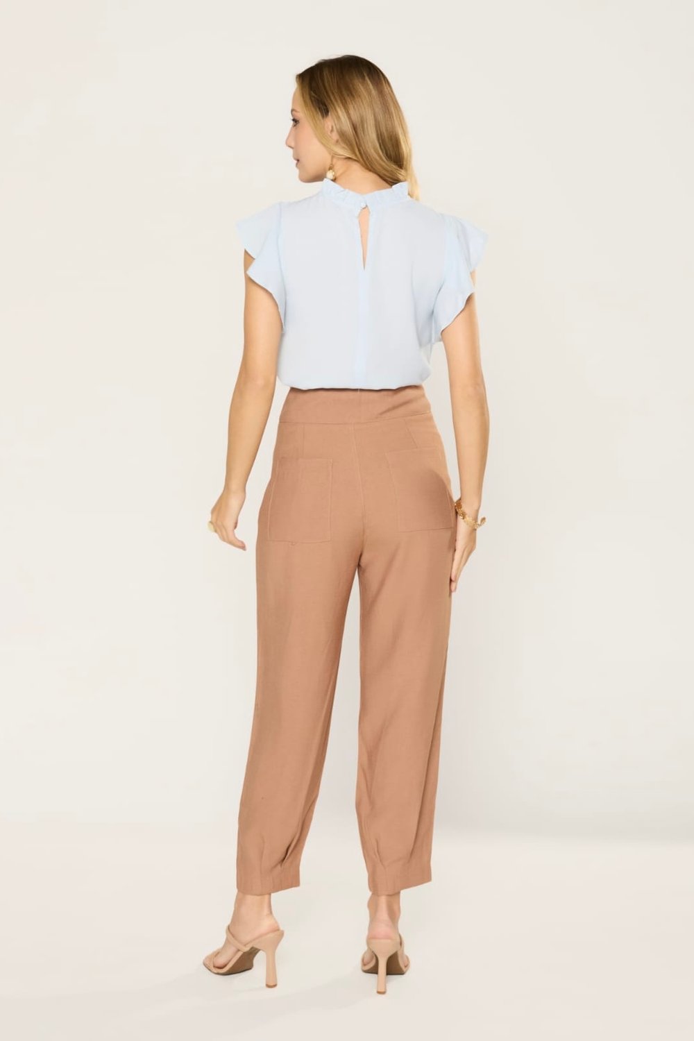 Essa calça é uma peça sofisticada e atemporal, pensada para trazer elegância e conforto ao mesmo tempo. O modelo apresenta cintura alta, que valoriza a silhueta e alonga a perna, além de possuir cós largo com fechamento frontal por botões, trazendo charme extra ao design. Possui pregas sutis na parte frontal, que criam um caimento fluido e ajudam a deixar o visual mais alinhado, sem perder o toque de leveza. O corte é reto levemente afunilado, proporcionando um ar moderno e versátil, perfeito tanto para produções casuais quanto para combinações mais formais. Além disso, a peça conta com bolsos laterais funcionais, que acrescentam praticidade ao dia a dia, sem comprometer a sofisticação do look. O tecido é leve e confortável, ideal para quem busca elegância aliada à liberdade de movimento.