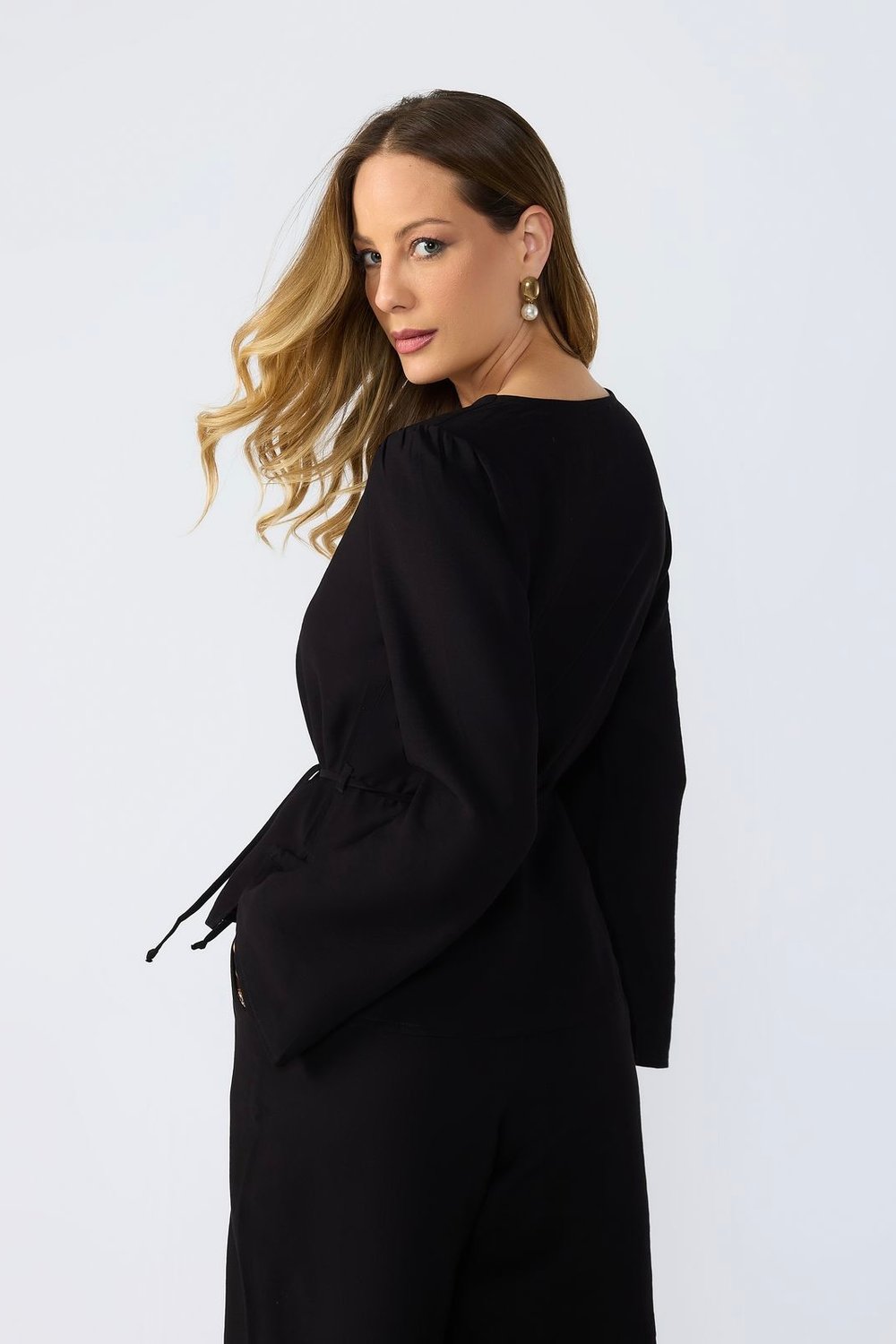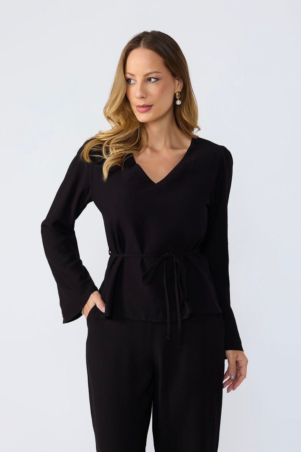 BLUSA MANGA LONGA DECOTE V CORDÃO CINTURA ISADORA