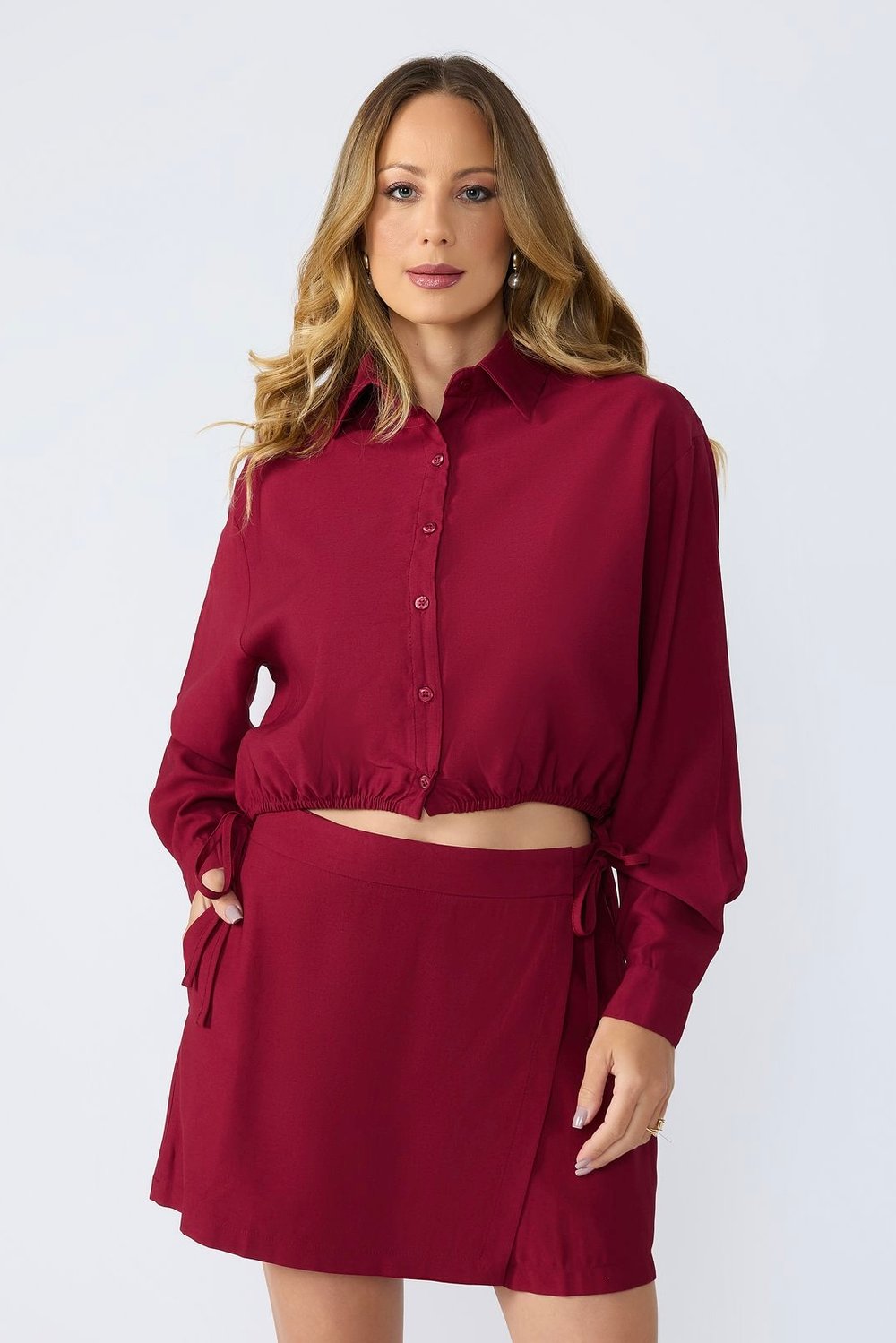 A Camisa Tânia é a escolha ideal para quem busca estilo com um toque despojado e moderno. Seu destaque está no detalhe franzido com elástico na barra, finalizado com delicados laços laterais que acrescentam charme ao visual. Com modelagem cropped e abotoamento frontal, a peça combina perfeitamente elegância e autenticidade.