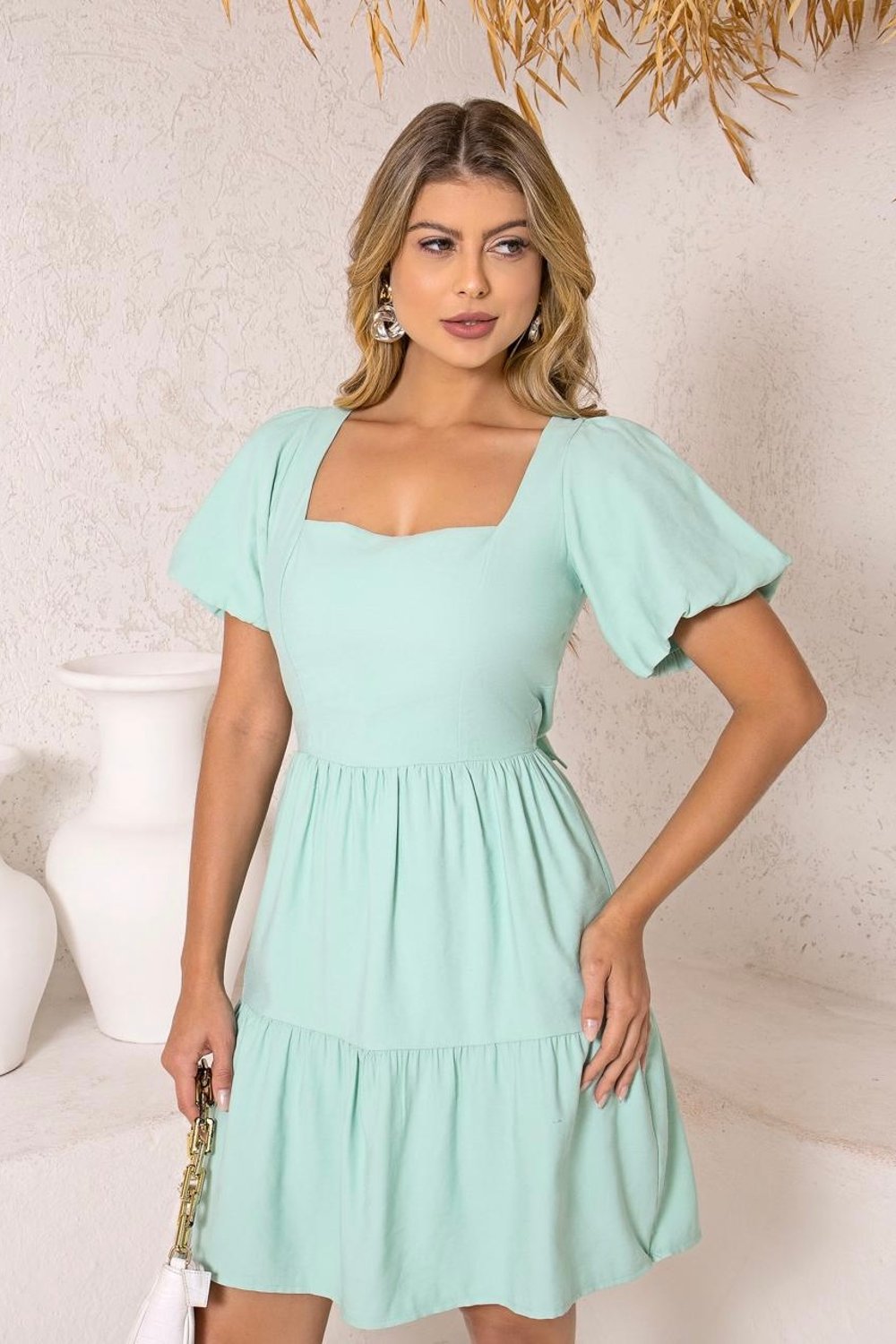 Delicado, feminino e cheio de charme, o Vestido Bruna Dois Amarras é a peça perfeita para dias ensolarados ou ocasiões especiais com um toque romântico. Seu decote quadrado valoriza o colo com elegância, enquanto as mangas bufantes e as amarrações nas costas adicionam charme e autenticidade à produção.
