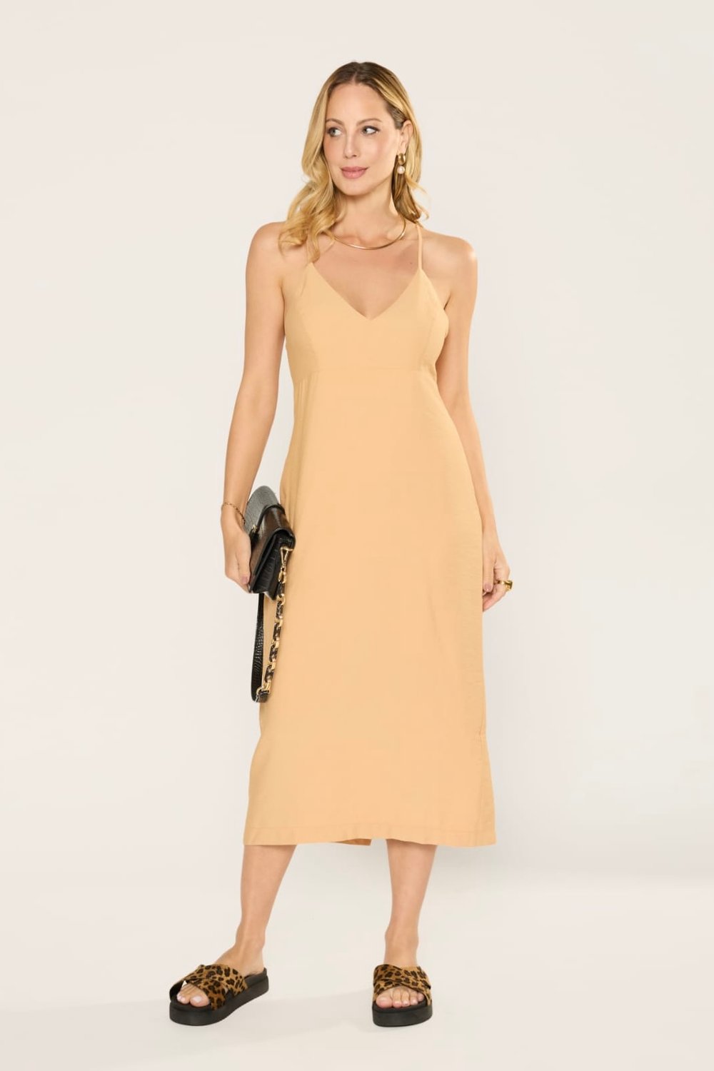 Com design atemporal e sofisticado, este vestido midi traz equilíbrio perfeito entre delicadeza e modernidade. O decote em “V” valoriza a região do colo com sutileza, enquanto as alças finas cruzadas nas costas criam um efeito elegante e contemporâneo. O detalhe de amarração posterior permite ajuste personalizado, garantindo caimento impecável ao corpo.A modelagem acinturada realça a silhueta sem perder o conforto, proporcionando leveza e fluidez ao caminhar. A fenda discreta na parte de trás une praticidade e charme, tornando a peça ideal tanto para ocasiões especiais quanto para produções mais versáteis e estilosas.