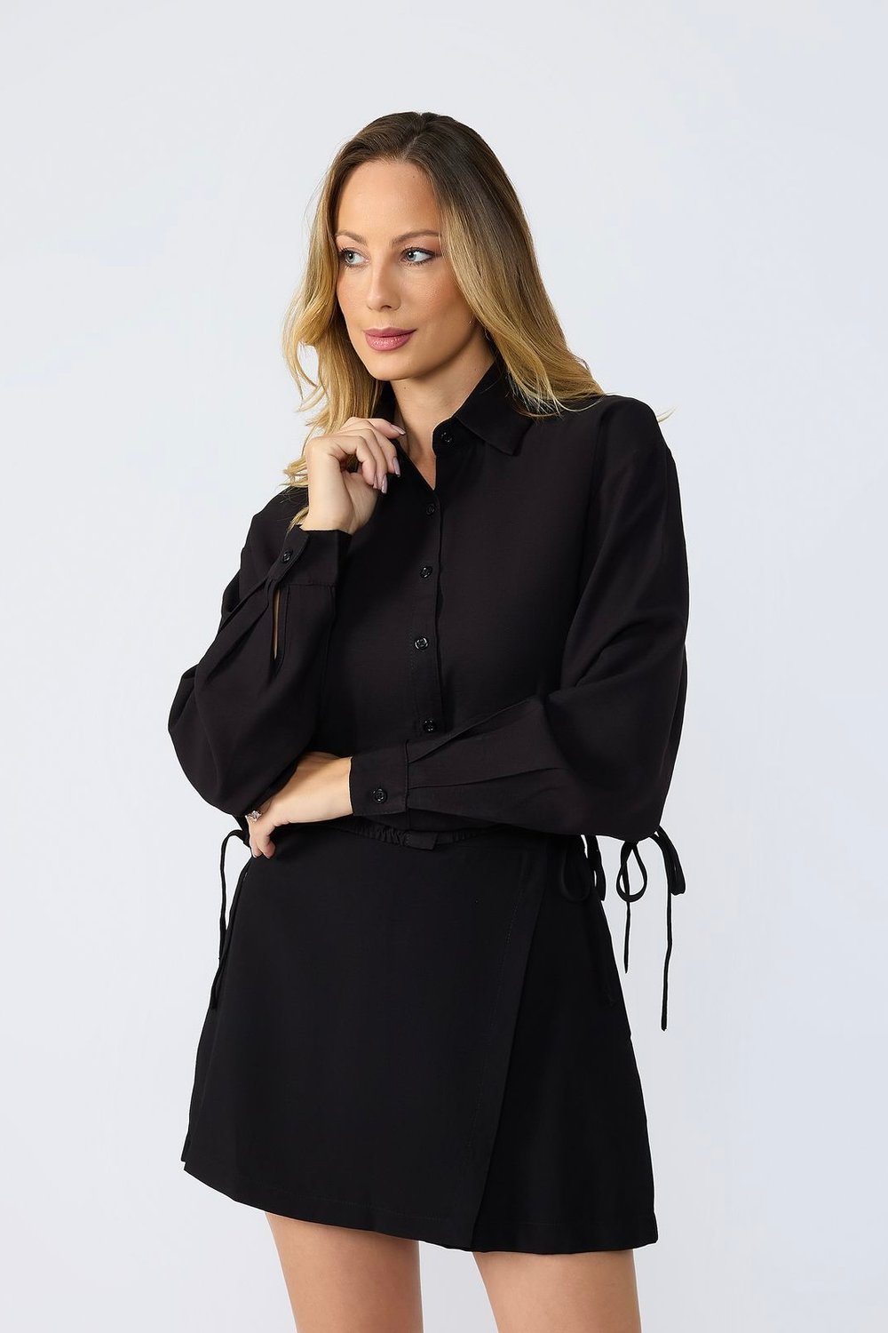 - Modelo short-saia com sobreposição frontal