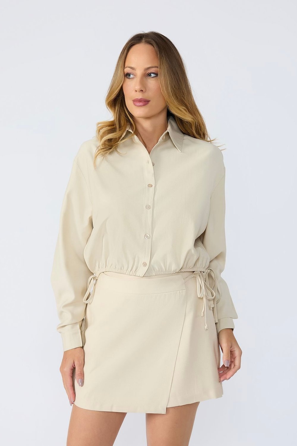- Modelo short-saia com sobreposição frontal