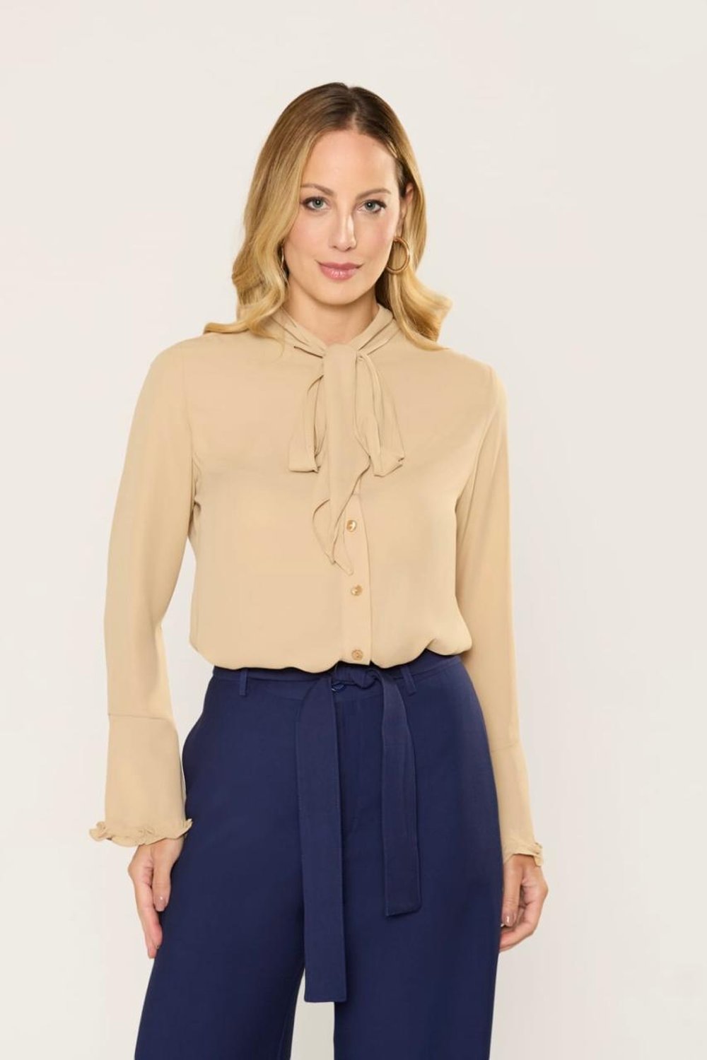 Elegante e atemporal, a Blusa Analiz traz sofisticação na medida certa para o seu dia a dia ou ocasiões especiais. Com detalhe de amarração na gola, ela proporciona um charme extra ao visual, podendo ser usada com laço ou nó simples, dependendo do seu estilo.