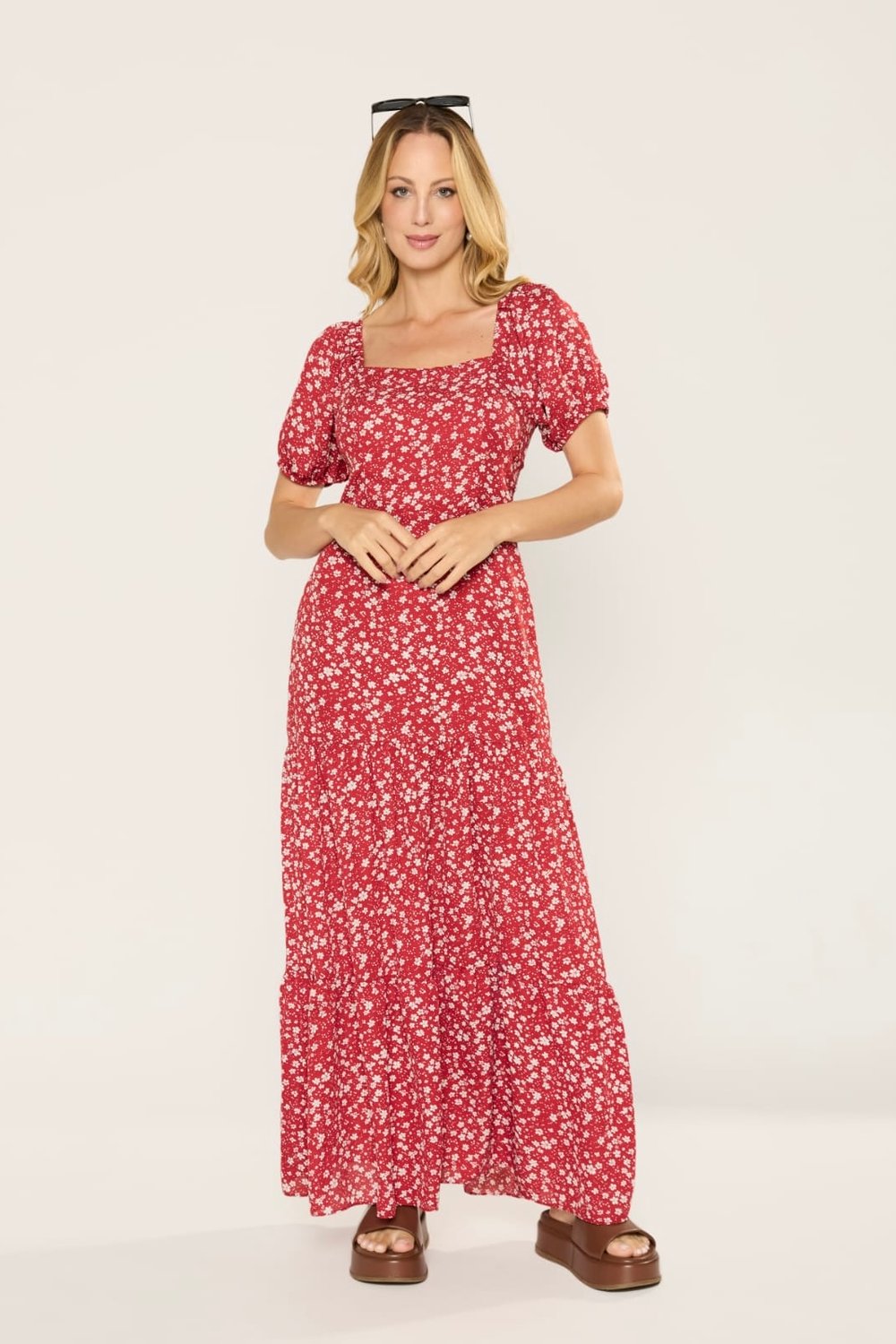 Com um visual romântico e delicado, este vestido longo é a escolha perfeita para quem busca leveza e feminilidade. A modelagem fluida acompanha suavemente o corpo, enquanto o decote quadrado confere um charme vintage à peça. As mangas curtas bufantes trazem volume na medida certa, criando um visual marcante e atual. Na parte de trás, o detalhe em lastex proporciona conforto e ajuste perfeito à silhueta. A saia em camadas valoriza ainda mais o caimento.