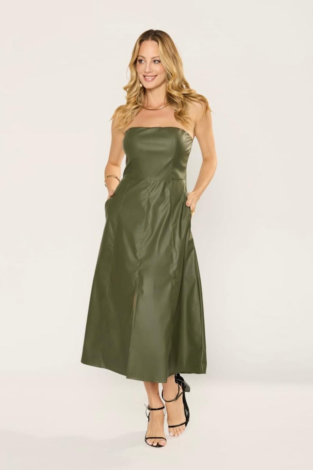 VESTIDO TOMARA QUE CAIA POLIURETANO BOLSO FENDA JULIANA